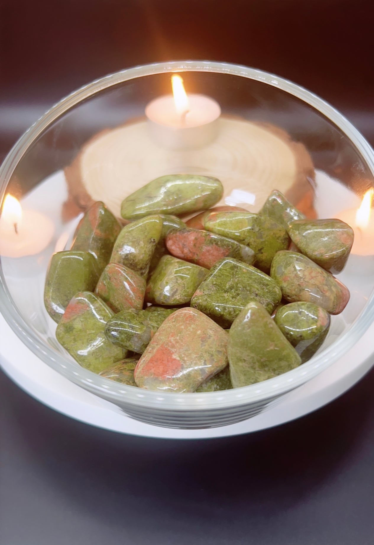 Unakite is said to be a stone of vision, opening the third eye and useful for scrying. It is also believed to be a stone of balance, grounding the self while bringing emotions and spirituality together.